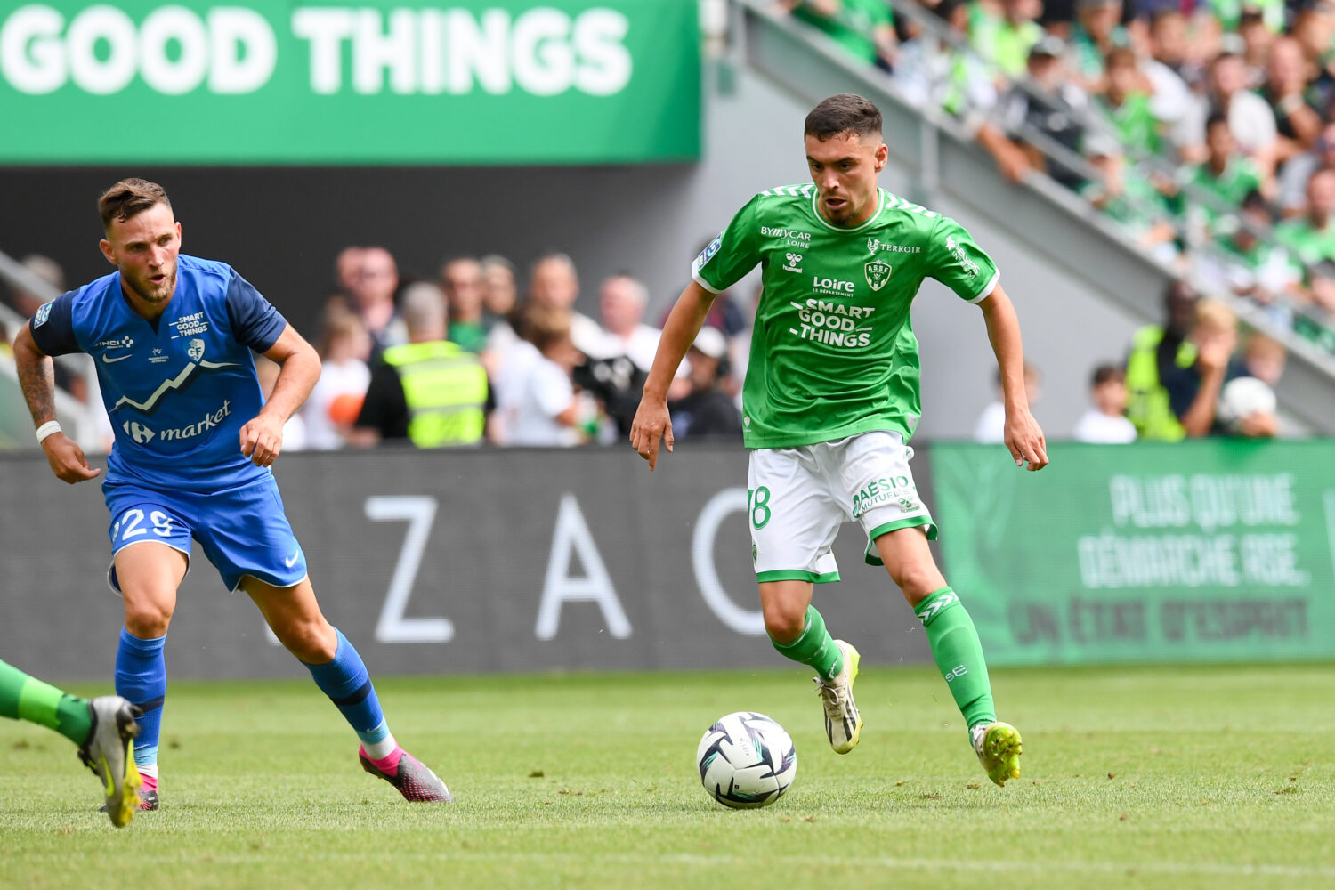 29 Gaetan PAQUIEZ (gf38) - 18 Mathieu CAFARO (asse) during the Ligue 2 BKT match between Saint Etienne and Grenoble at Stade Geoffroy-Guichard on August 5, 2023 in Saint-Etienne, France. (Photo by Philippe Lecoeur/FEP/Icon Sport)