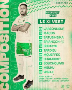 Les Verts affrontent Grenoble ce soir à l'occasion de la 34ème journée de Ligue 2. Le GF38 est à la 10ème place au classement alors que les Verts sont actuellement dans la course à la montée et ne doivent pas laisser Angers prendre de l'avance. Voici le onze choisi par Olivier Dall'Oglio pour cette rencontre qui se déroulera au Stade des Alpes !