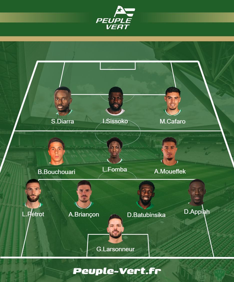 Le trio du milieu de terrain est le plus dur à imaginer. De nombreuses options existent dans un secteur où l'ASSE se montre très fourni. Fomba pourrait être aligné en pointe basse du milieu à trois. Pour combler l'absence de Florian Tardieu, suspendu, le néo-coach stéphanois va devoir trancher.