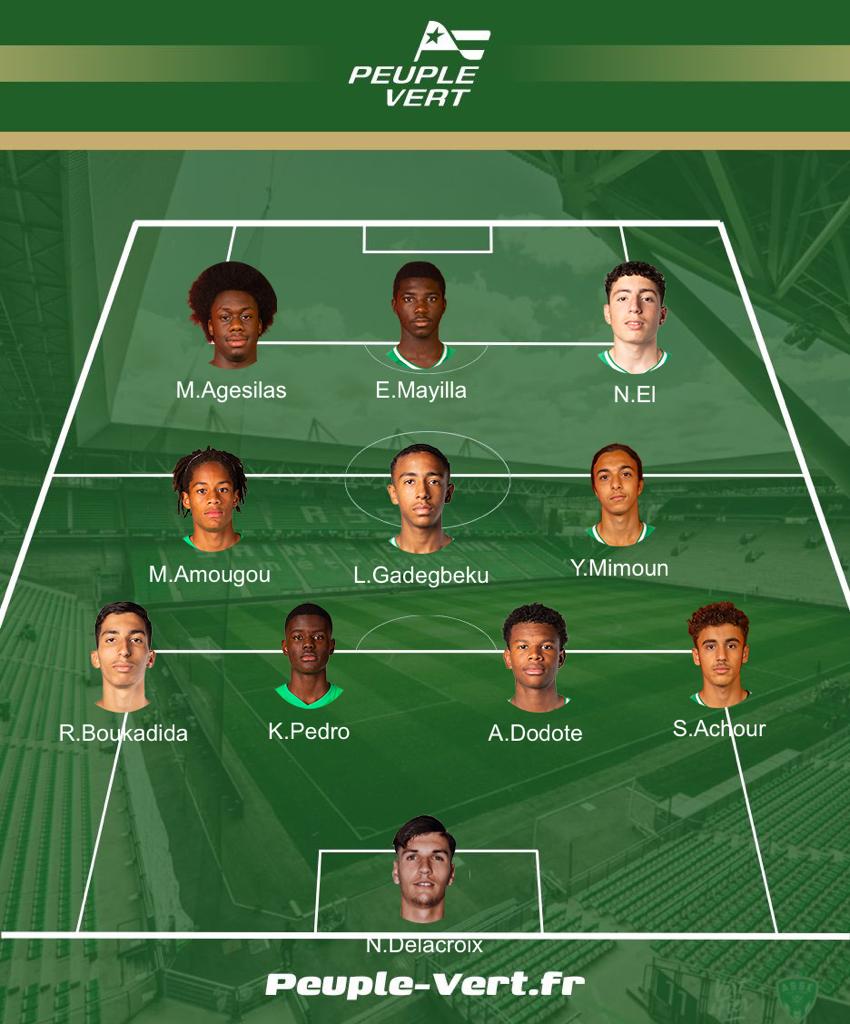 Le début de ce seizième de finale face à l'ASNL est très équilibré. Il faudra attendre la 25ème minute pour voir les stéphanois se procurer une première occasion par l'intermédiaire d'Enzo Mayilla. Puis, Mathis Amougou tentera lui aussi sa chance après un numéro individuel. Pas grand chose de plus à signaler à la pause. 0-0.