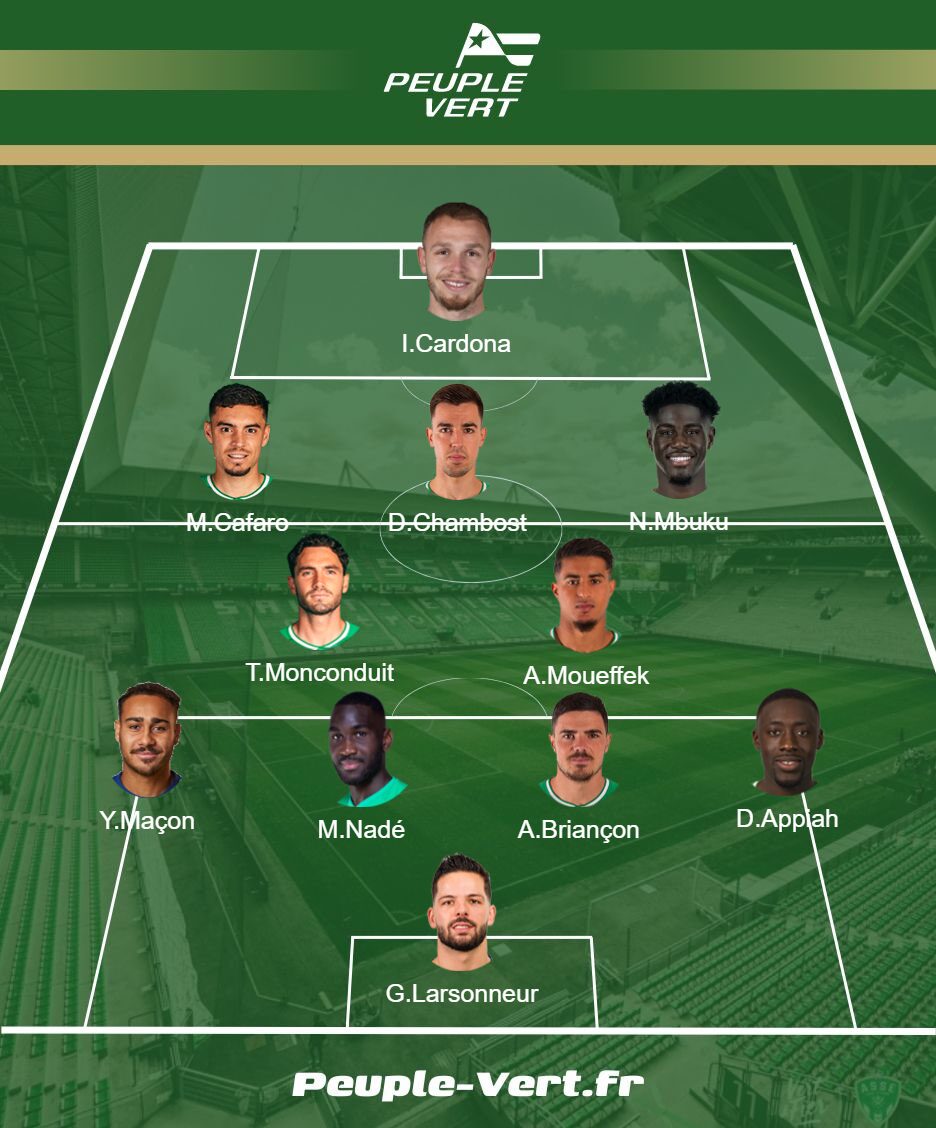 Mathieu Cafaro va occuper l’aile gauche de l’attaque stéphanoise, le joueur formé à Toulouse enchaîne à nouveau malgré des performances critiquées par les supporters depuis plusieurs rencontres désormais. Sur l’aile droite, Nathanaël Mbuku connaîtra, ce soir, sa première titularisation dans le chaudron. Le joueur prêté par Ausbourg ne demande qu’à enchaîner les matchs, lui qui n’avait plus démarré un match en professionnel depuis avril 2022.