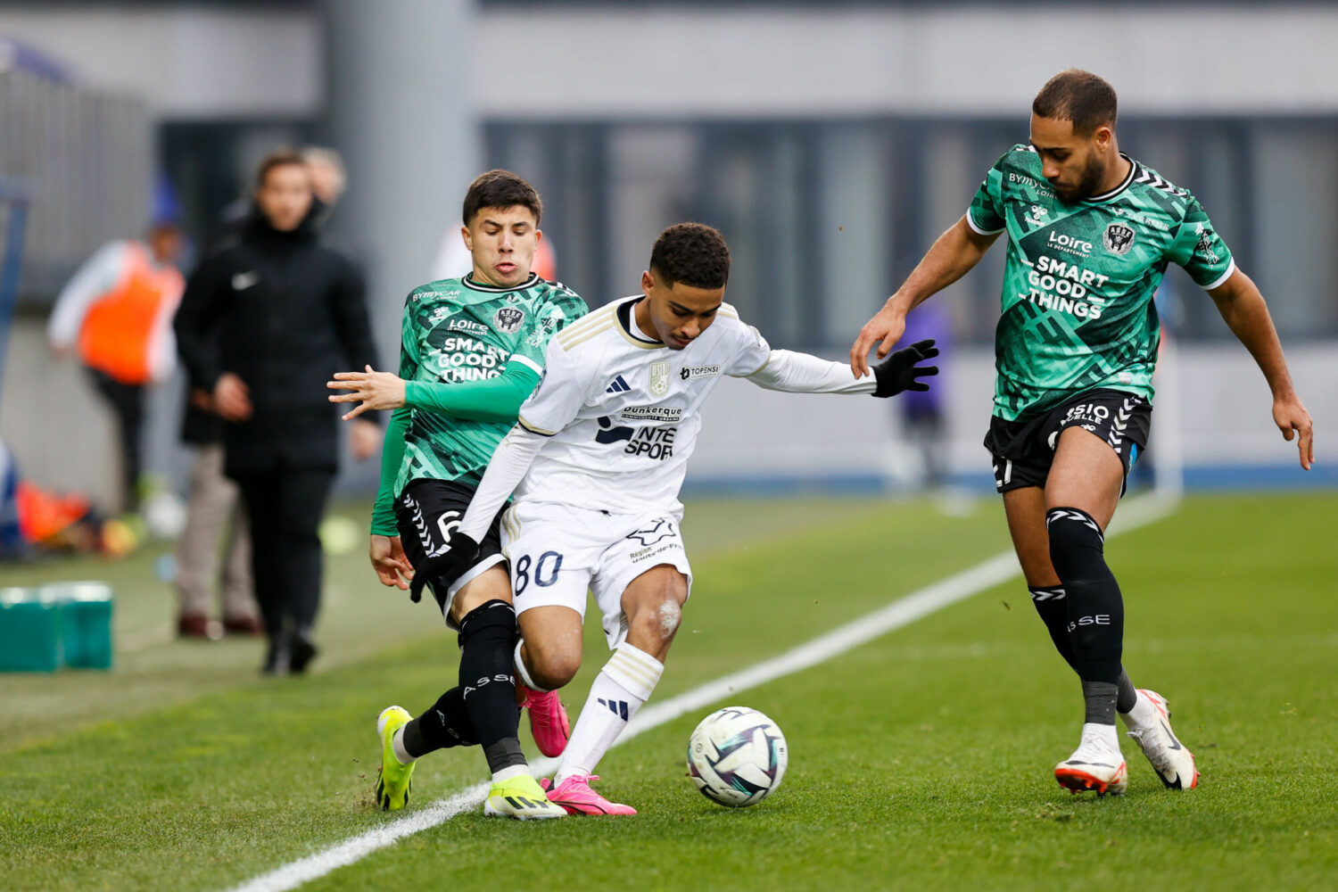 27 Yvann MACON (asse) - 80 Gessime YASSINE (usld) - 06 Benjamin BOUCHOUARI (asse) during the Ligue 2 BKT match between Union Sportive du Littoral de Dunkerque and Association Sportive de Saint-Etienne at Marcel Tribut Stadium on February 3, 2024 in Dunkerque, France. (Photo by Loic Baratoux/FEP/Icon Sport)