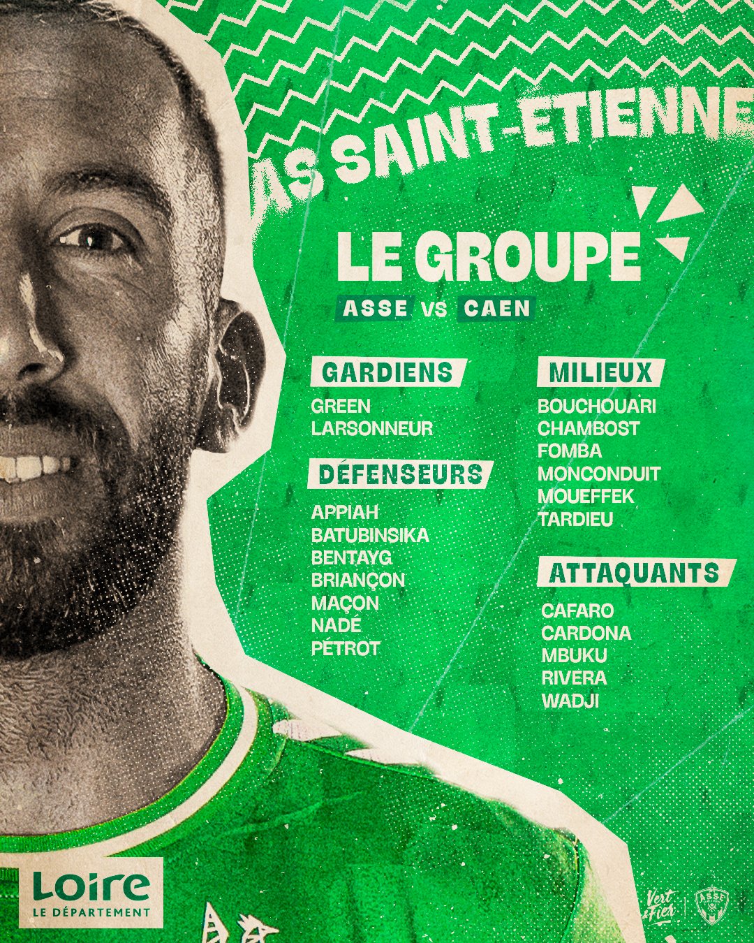 L'ASSE continue sa course pour la montée en Ligue 1. Suivis par tout le Peuple Vert, les hommes d'Olivier Dall'Oglio vont recevoir Caen dans un Geoffroy-Guichard plein à craquer. L'entraîneur des Verts a communiqué la liste de 18 joueurs convoqués pour la rencontre.