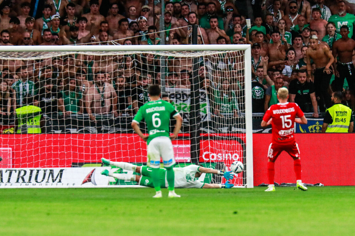 Penalty Gautier LARSONNEUR of Saint Etienne and Lucas WOUDENBERG of Valenciennes during the Ligue 2 BKT match between Association Sportive de Saint-Etienne and Valenciennes Football Club at Stade Geoffroy-Guichard on September 2, 2023 in Saint-Etienne, France. (Photo by Romain Biard/Icon Sport)