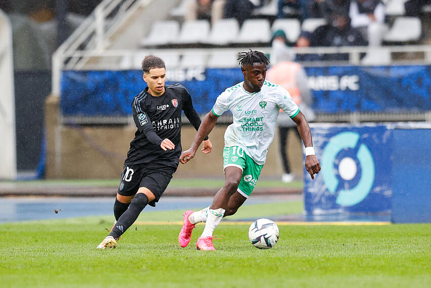 10 Ilan KEBBAL (pfc) - 10 Nathanael MBUKU (asse) during the Ligue 2 BKT match between Paris FC and Saint Etienne at Stade Charlety on March 2, 2024 in Paris, France. (Photo by Loic Baratoux/FEP/Icon Sport) - Photo by Icon Sport