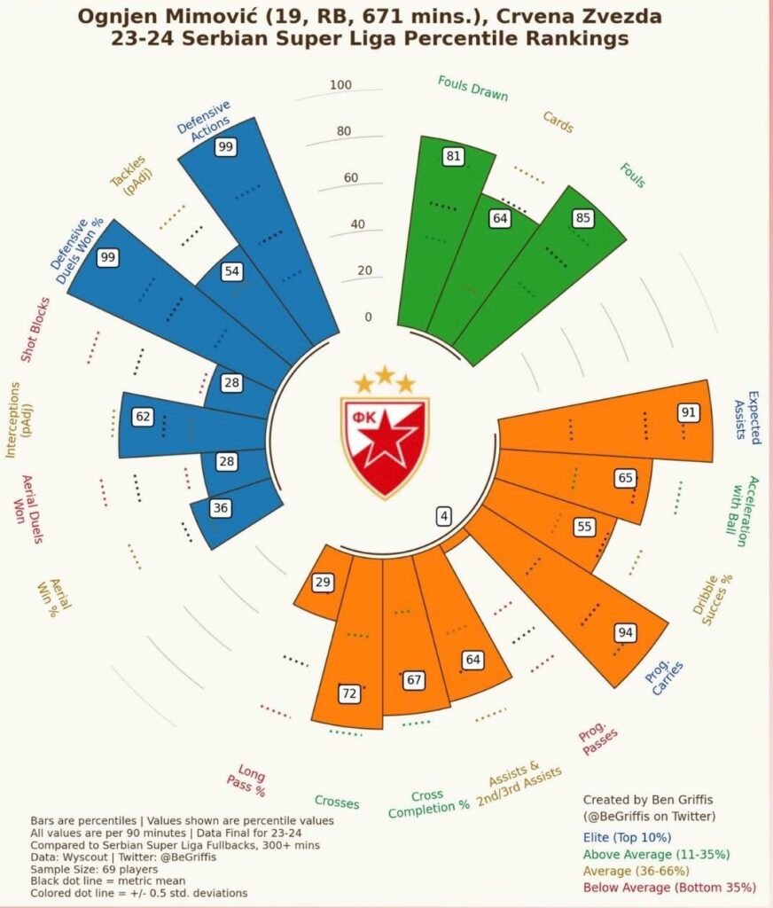 "Ognjen Mimović, latéral droit de l’Étoile Rouge de Belgrade, est un joueur reconnu pour sa qualité de passes et ses centres en retrait. Doté d’une excellente précision sur ses passes courtes, il privilégie les solutions axiales et peut alimenter ses coéquipiers avec ses deux pieds en passes courtes. Fin techniquement sur ses premières touches, il excelle à fixer un adversaire pour s’ouvrir des angles de passes ou de centres. Toutefois, son dribble reste perfectible lorsqu’il s’agit d’éliminer directement un opposant.