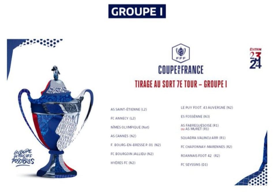 Dans cette liste communiquée par la FFF pour ce 7ᵉ tour de coupe de France figure Annecy (L2), Nimes (N1), Cannes (N2), Bourgoin Jallieu (N2), Hyères (N2), Le Puy (N2), Fossenne (N3), Squadra Valincu ARR (R1), Fabreguesoise (R1) ou AS Muret (R1), Chaponnay Marennes (R2), Roannais Foot (R2), FC Seyssins (D1).