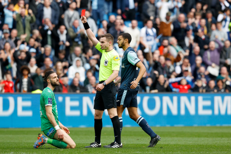 Guillaume PARADIS (ARBITRE) - 19 Leo PETROT (asse) - 21 Antoine JOUJOU (hac) during the Ligue 2 BKT match between Le Havre and Saint-Etienne at Stade Oceane on March 18, 2023 in Le Havre, France. (Photo by Loic Baratoux/FEP/Icon Sport)