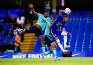 Chelsea's Hakim Ziyech (right) battles for the ball with Leicester City's Wesley Fofana (left) and Leicester City's Timothy Castagne (centre) during the Premier League match at Stamford Bridge, London. Picture date: Thursday May 19, 2022. - Photo by Icon sport