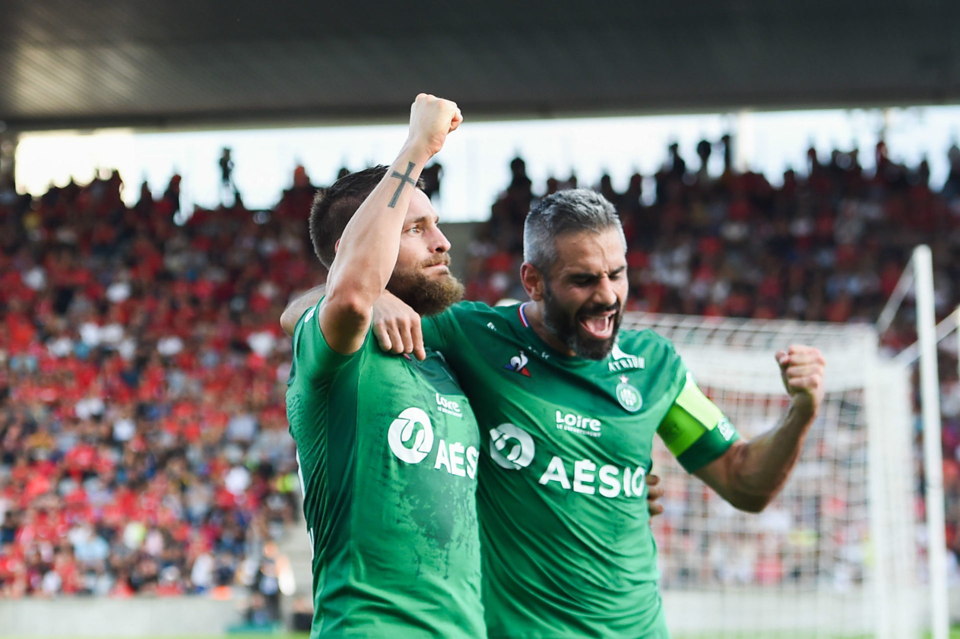 Mathieu DEBUCHY of Saint-Etienne celebrates his scoring with Loic PERRIN of Saint-Etienne during the Ligue 1 match between Nimes and Saint Etienne on September 29, 2019 in Nimes, France. (Photo by Alexandre Dimou/Icon Sport) - Mathieu DEBUCHY - Loic PERRIN - Stade des Costières - Nimes (France)