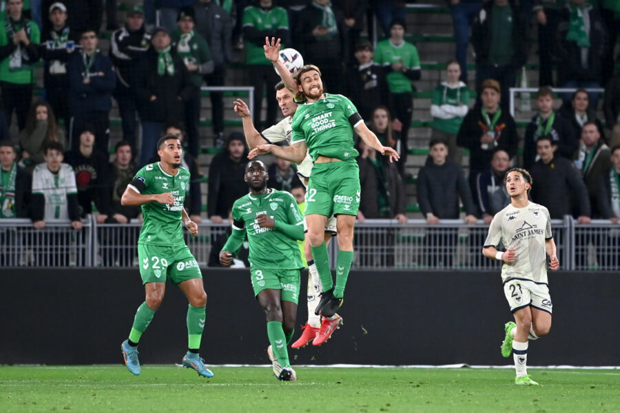 29 Romain THOMAS (smc) - 29 Aimen MOUEFFEK (asse) - 22 Victor LOBRY (asse) during the Ligue 2 BKT match between Saint-Etienne and Caen at Stade Geoffroy-Guichard on December 30, 2022 in Saint-Etienne, France. (Photo by Alexandre Dimou/FEP/Icon Sport)