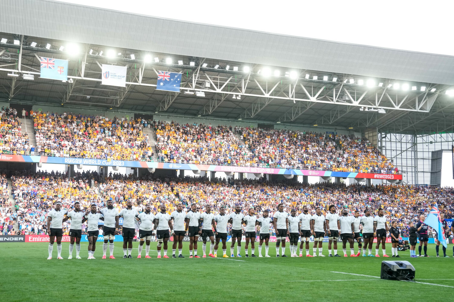 Team of Fidji during the Rugby World Cup 2023 match between Australia and Fiji at Stade Geoffroy-Guichard on September 17, 2023 in Saint-Etienne, France. (Photo by Hugo Pfeiffer/Icon Sport)