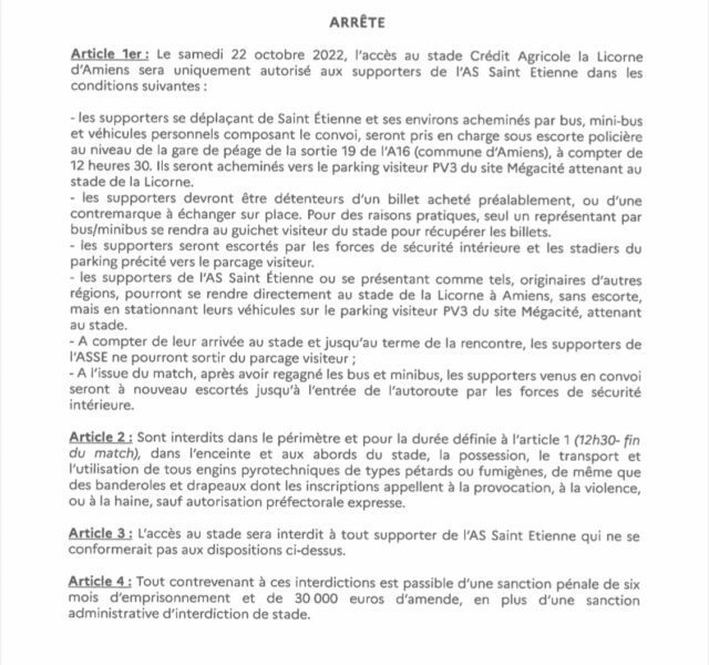 Si l'AS Saint-Etienne peut se dĂ©placer pour la grande majoritĂ© des dĂ©placements cette saison, il n'en reste pas moins que les arrĂȘtĂ©s restent frĂ©quents. Les PrĂ©fets dĂ©partementaux n'hĂ©sitent pas Ă prendre des mesures pour encadrer les dĂ©placements des supporters des Verts.