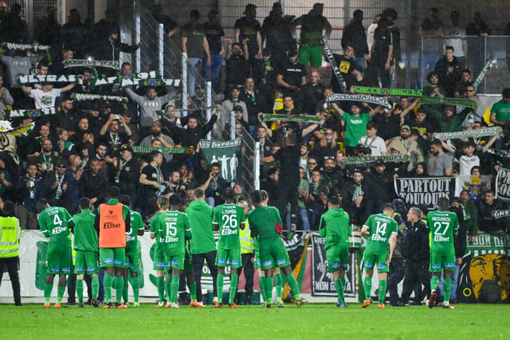 Team of Saint-Etienne thanks his fans during the Ligue 2 BKT match between Rodez and Saint Etienne at Paul Lignon Stadium on April 29, 2023 in Rodez, France. (Photo by Alexandre Dimou/Alexpress/Icon Sport)