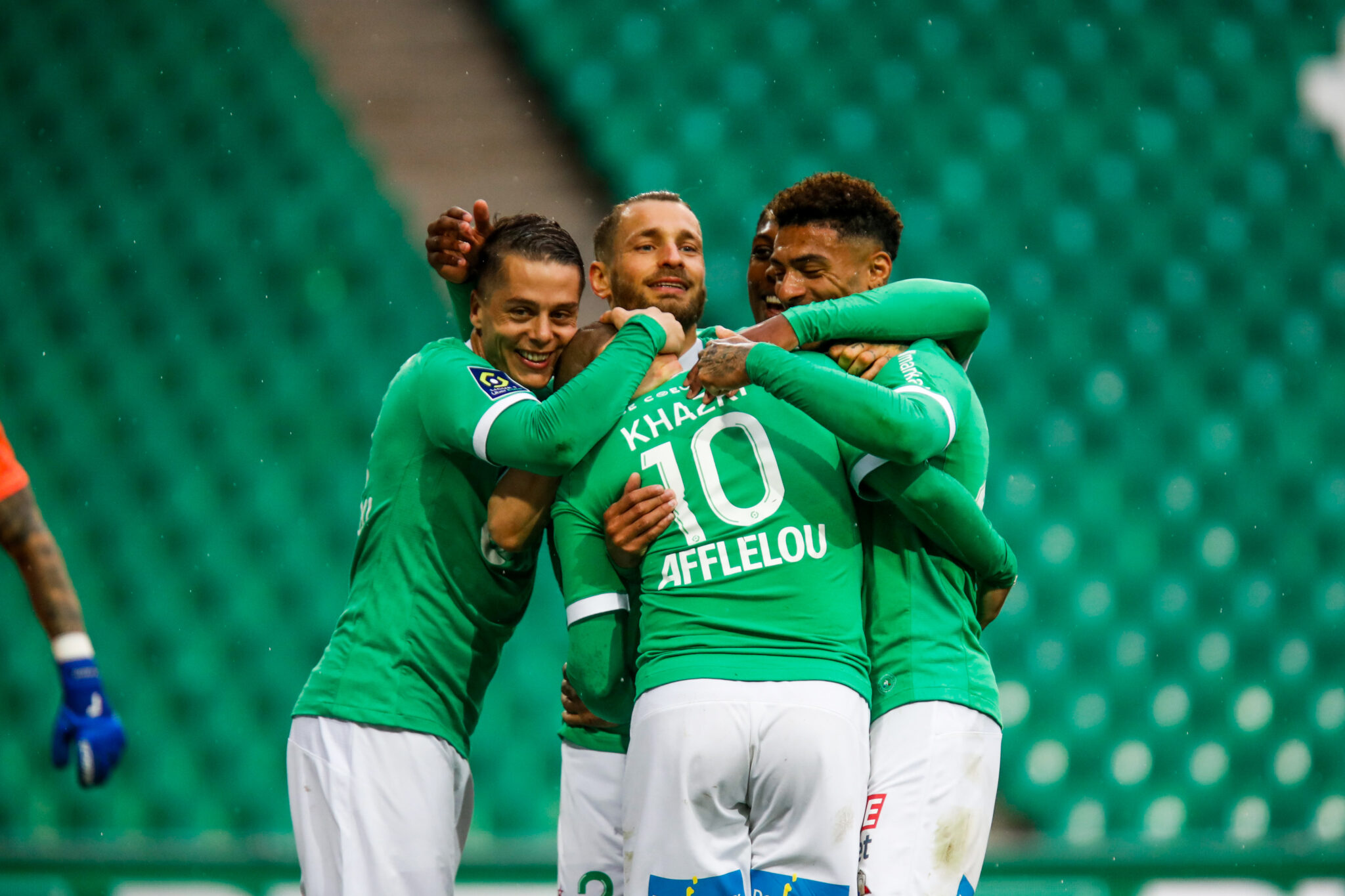 Wahbi KHAZRI of Saint Etienne goal and Denis BOUANGA of Saint Etienne and Romain HAMOUMA of Saint Etienne and Mathieu DEBUCHY Saint Etienne during the Ligue 1 match between Saint-Etienne and Bordeaux at Stade Geoffroy-Guichard on April 11, 2021 in Saint-Etienne, France. (Photo by Romain Biard/Icon Sport) - Romain HAMOUMA - Wahbi KHAZRI - Mathieu DEBUCHY - Denis BOUANGA - Stade Geoffroy-Guichard - Saint Etienne (France)