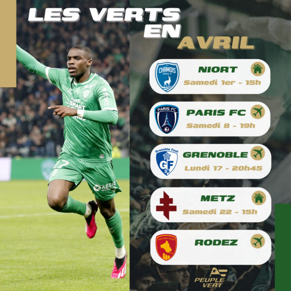 Ce sera le cas le 1er avril pour la reprise du championnat face à Niort à Geoffroy-Guichard. Le week-end suivant, lors du week-end de Pâques, les Stéphanois joueront, une fois n'est pas coutume, le samedi à 19h face au Paris FC à Charléty (diffusé sur Prime Video). Ensuite, les Verts se déplaceront chez leurs voisins grenoblois le lundi 17 avril à 20h45.
