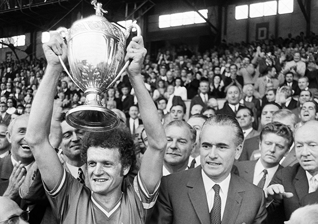 Saint-Etienne's French captain Robert Herbin (L) holds the cup next to French Prime Minister Jacques Chaban-Delmas after winning the 53rd French cup final football match between Nantes and Saint-Etienne in Colombes on November 19, 2016. (Photo by STR / AFP)