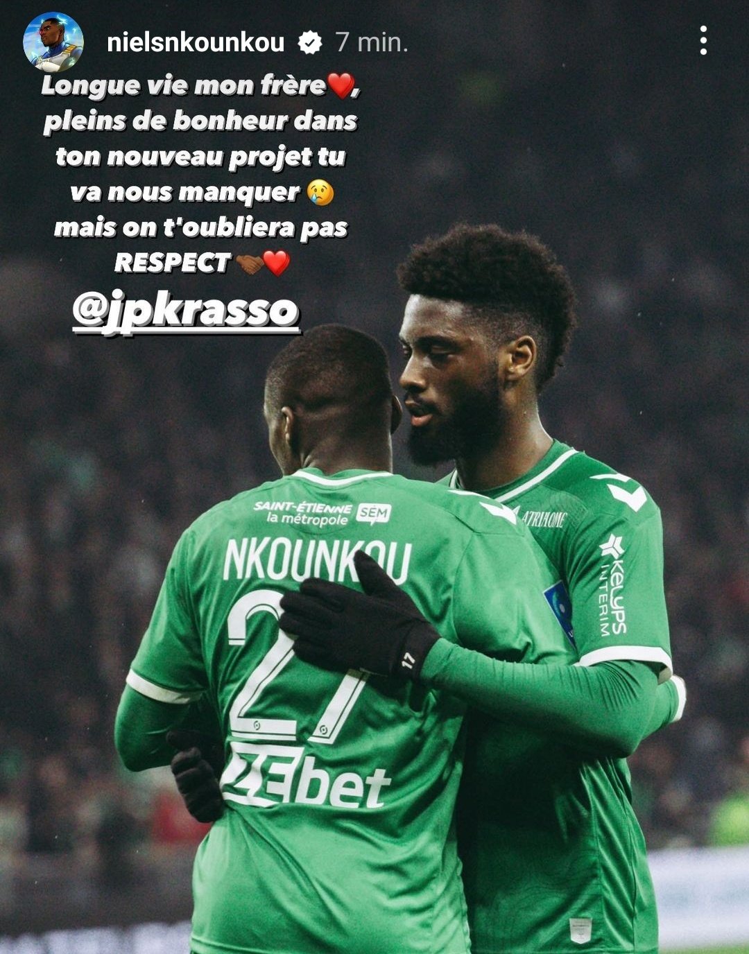 Niels Nkounkou a donné signe de vie sur les réseaux sociaux. Alors que de nombreux supporters ont regretté son silence au moment d'annoncer sa signature à l'ASSE publiquement sur les réseaux, le piston gauche des Verts semble sortir du bois pour rendre hommage à son compère Jean-Philippe Krasso, parti à l'Etoile Rouge de Belgrade.