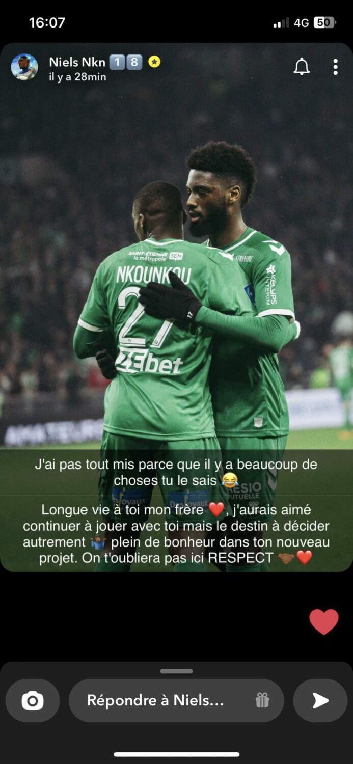 "J'ai pas tout mis parce qu'il y a beaucoup de choses tu le sais. Longue vie à toi mon frère, j'aurais aimé continuer à jouer avec toi mais le destin en a décidé autrement. Plein de bonheur pour ton nouveau projet. On t'oubliera pas ici, respect" a écrit l'ailier stéphanois sur SnapChat.