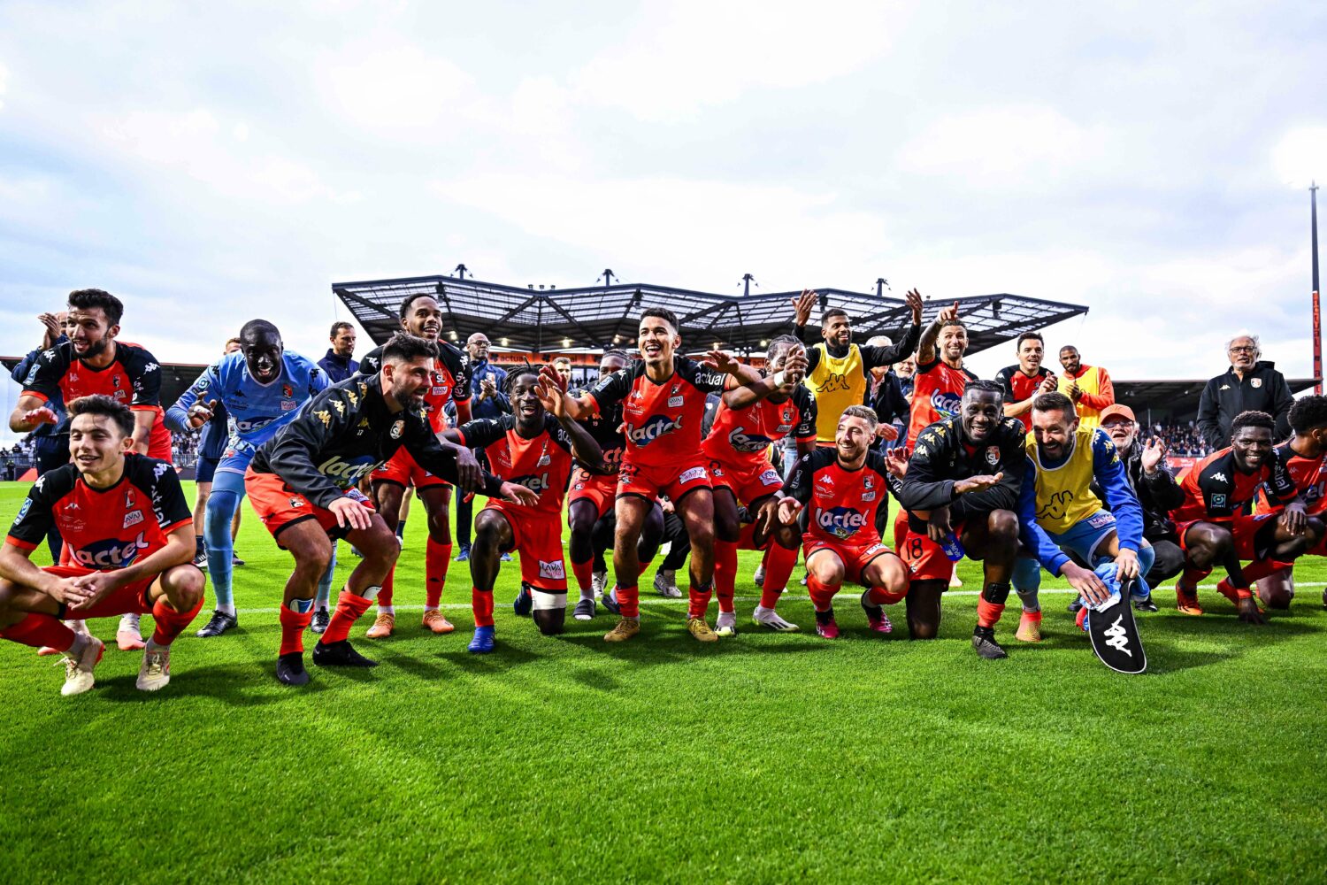 Players of Laval celebrate after the French Ligue 2 BKT soccer match between Laval and Angers SCO at Stade Francis-Le Basser on August 5, 2023 in Laval, France. (Photo by Baptiste Fernandez/Icon Sport)