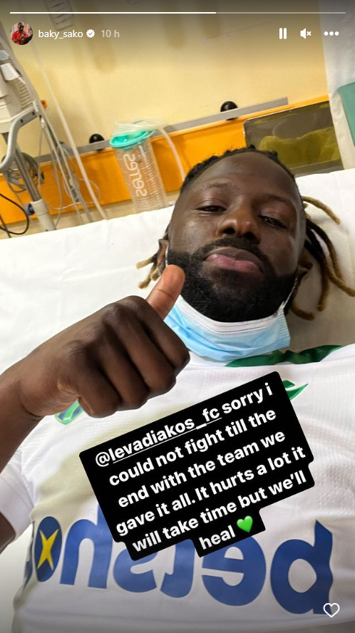Entré à la mi-temps de la rencontre entre PAS Lamia et son club de APO Levadiakos, Bakary Sako a été contraint de sortir à la 83ème minute de jeu sur blessure. Il a envoyé un message aux fans après la rencontre : "Je n'ai pas pu me battre jusqu'à la fin avec l'équipe, nous avons tout donné. Cela fait très mal, cela prendra du temps, mais nous guérirons."