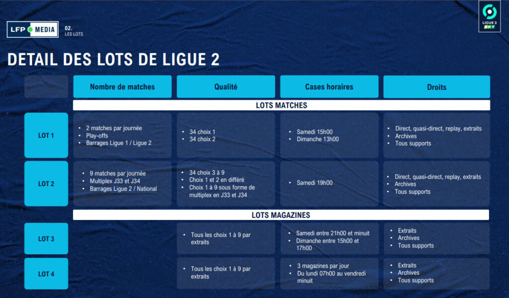 - Le lot 2 comprenant 6 matchs en direct et en exclusivité (choix 3, 5, 6, 7, 8 et 9) et un match en co-diffusion (choix 4) + les matchs 1 et 2 en différé. La mise à prix pour ce lot 2 est fixée à 270 millions d’euros avec un palier à 5M€.