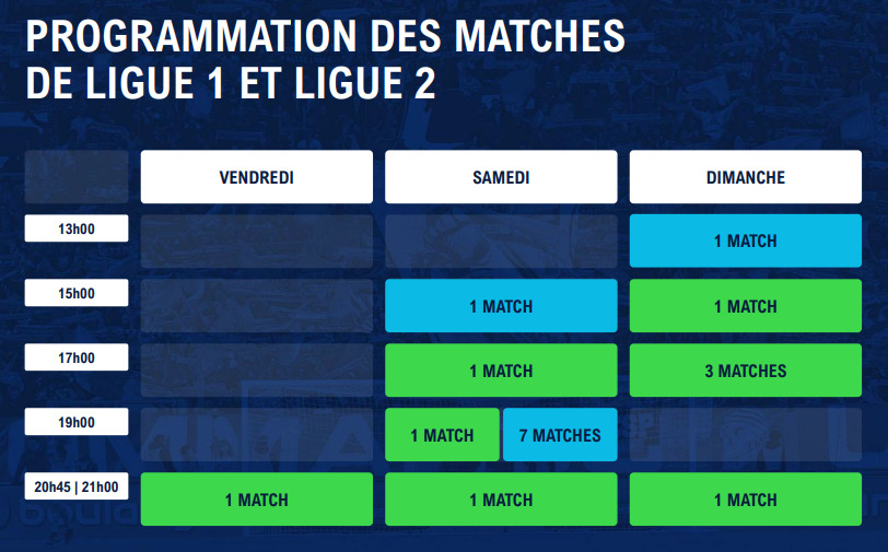 S'agissant de la Ligue 2, il va falloir que les supporters changent leurs habitudes en termes d'horaires. En effet, la tranche horaire du dimanche à 13h, laissée libre par la ligue 1, est dorénavant occupée par la Ligue 2. Les matches du lundi disparaissent enfin, objet d'une lutte incessante par les groupes de supporters depuis des années.