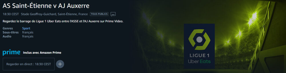 La rencontre ASSE - AJ Auxerre sera disponible sur la plateforme AMAZON PRIME Vidéo via le Pass Ligue 1. Prise d'antenne à 18h40 pour la présentation du match.