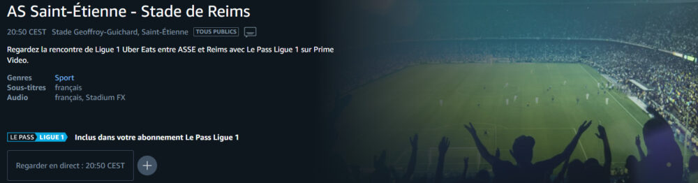 La rencontre ASSE - Stade de Reims sera disponible sur la plateforme AMAZON PRIME Vidéo via le Pass Ligue 1. Prise d'antenne à 20h50 pour la présentation du match.
