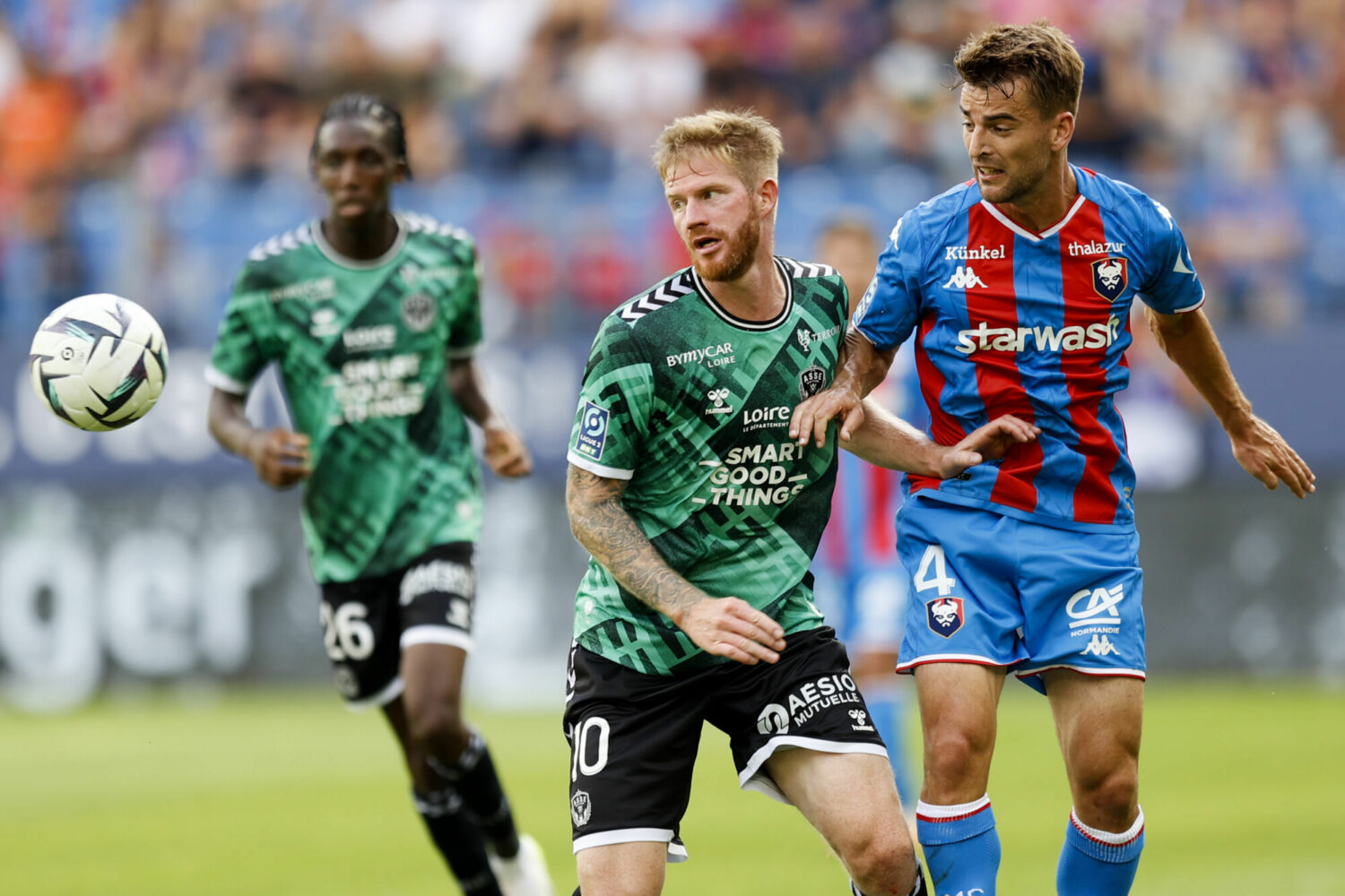 10 Gaetan CHARBONNIER (asse) - 04 Valentin HENRY (smc) during the Ligue 2 BKT match between Stade Malherbe Caen and Association Sportive de Saint Etienne at Stade Michel D'Ornano on September 16, 2023 in Caen, France. (Photo by Loic Baratoux/FEP/Icon Sport)