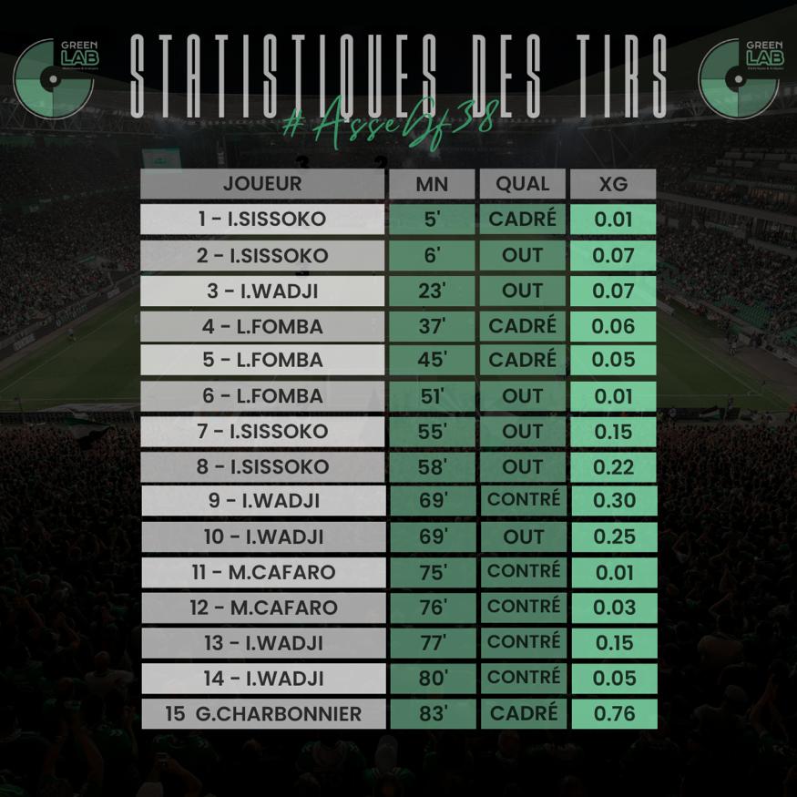 Les Verts n’ont pas su concrétiser leurs occasions pour faire basculer la rencontre, frappant au but à 15 reprises, seulement 4 tentatives ont accroché le cadre de Brice Maubleu (26.7% de tirs cadrés). I.Wadji est le stéphanois qui a le plus tenté sa chance : 5 tirs (0 cadré), I.Sissoko a frappé à 4 reprises pour sa première apparition sous le maillot vert (1 tir cadré), L.Fomba vient compléter le podium des tireurs avec 3 tirs (2 cadrés).