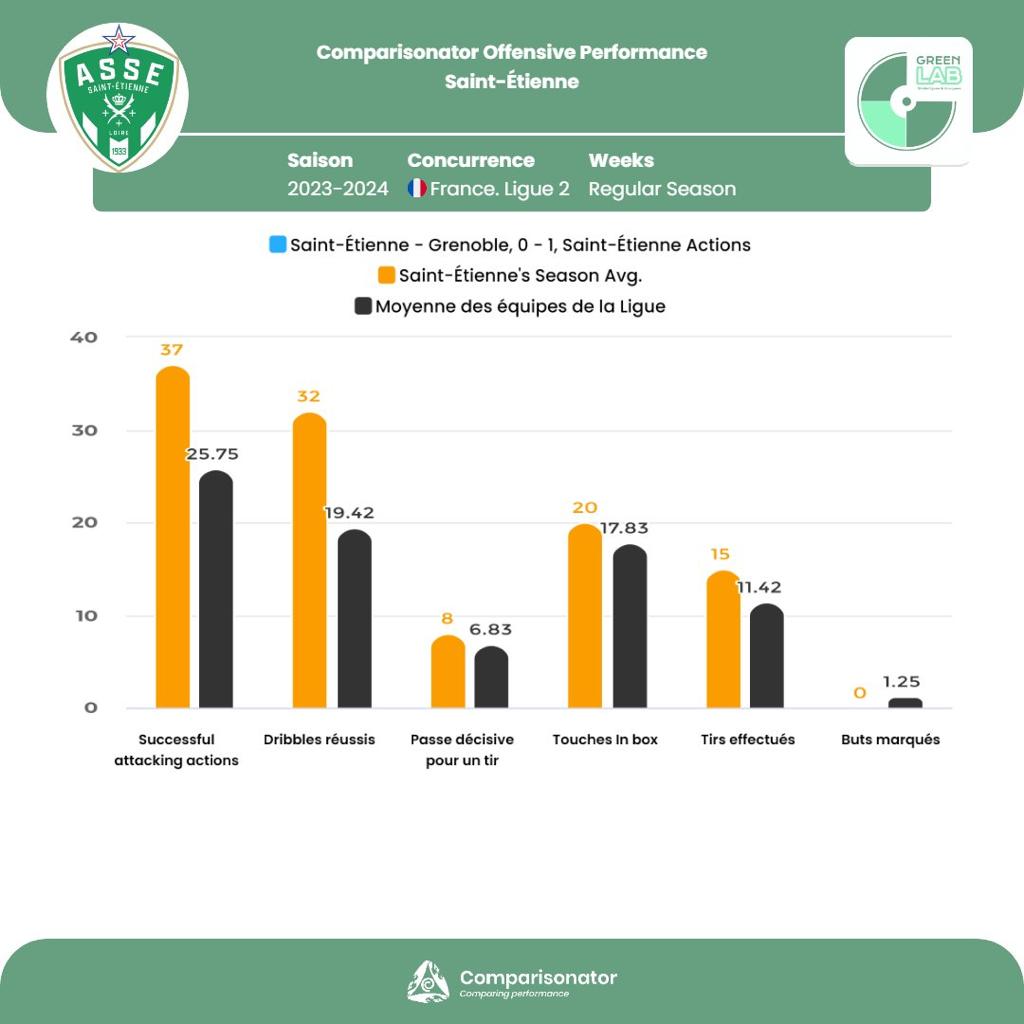Notre partenaire Comparisonator, expert de la data football, nous permet d'illustrer le manque de réalisme des Verts en comparant les performances offensives de l’ASSE lors de la rencontre avec la moyenne de celle des autres équipes du championnat lors de cette première journée.
