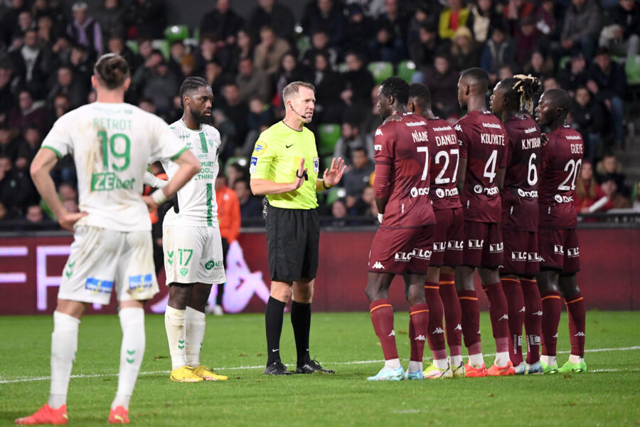 Olivier THUAL (ARBITRE) - 17 Jean-Philippe KRASSO (asse) during the Ligue 2 BKT match between FC Metz and AS Saint-Etienne at Stade Saint-Symphorien on November 7, 2022 in Metz, France. (Photo by Anthony Bibard/FEP/Icon Sport) - Photo by Icon sport