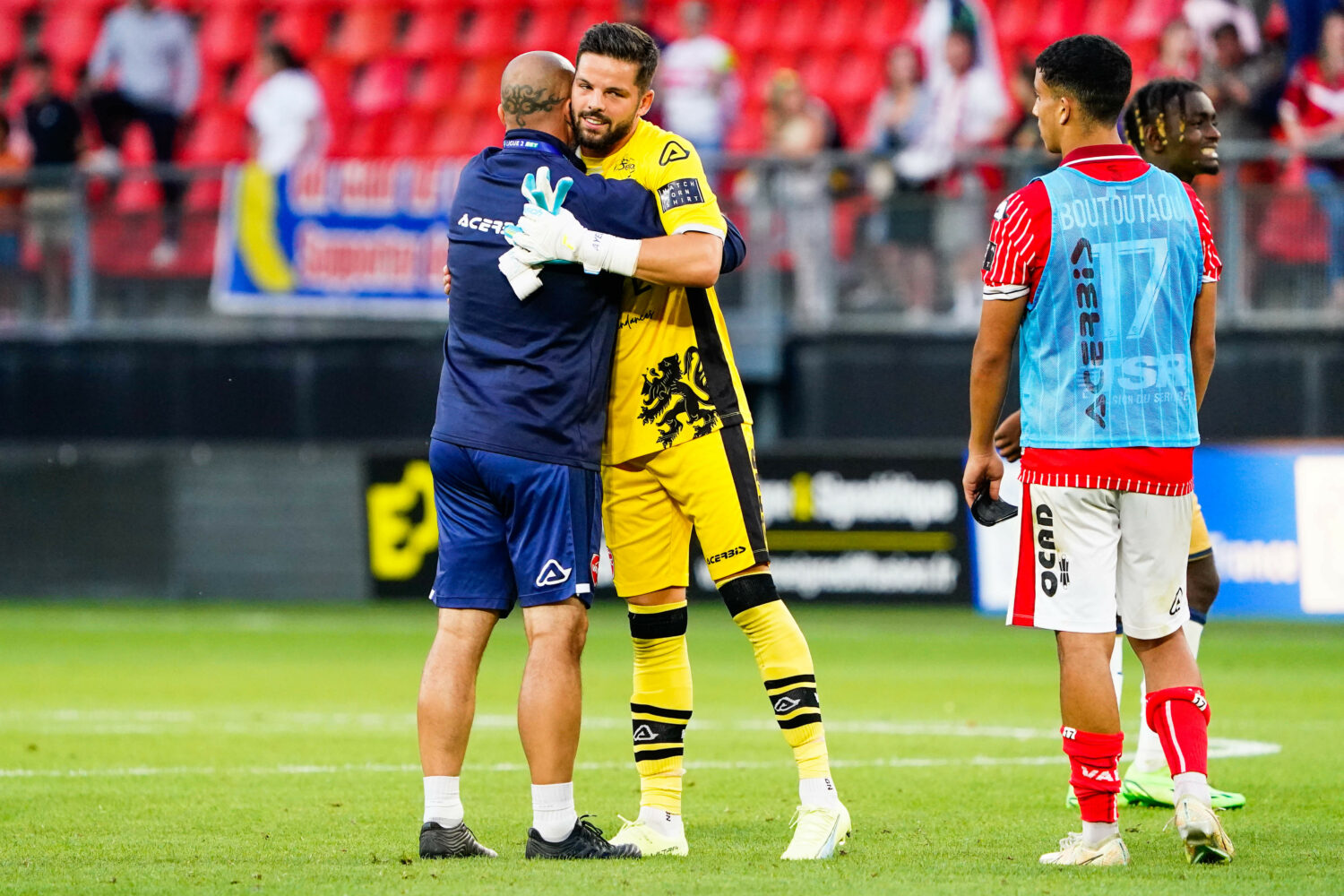 Jeremie JANOT of Valenciennes celebrates with Gautier LARSONNEUR of Valenciennes during the Ligue 2 BKT match between Valenciennes and Le Havre at Stade du Hainaut on August 6, 2022 in Valenciennes, France. (Photo by Sandra Ruhaut/Icon Sport)