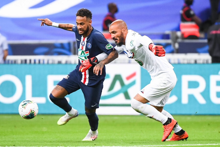 NEYMAR Jr of Paris Saint Germain and Jessy MOULIN of Saint Etienne during the French Cup Final soccer match between Paris Saint Germain and Saint Etienne at Stade de France on July 24, 2020 in Paris, France. (Photo by Baptiste Fernandez/Icon Sport)