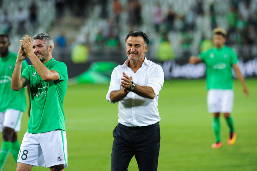 Fabien LEMOINE of Saint Etienne and Christophe GALTIER coach of Saint Etienne during the UEFA Europa League match between Saint Etienne and Beitar Jerusalem at Stade Geoffroy-Guichard on August 25, 20