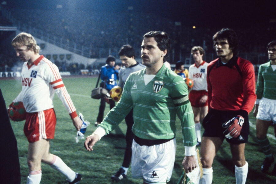 Horst Hrubesch of Hamburger and Christian Lopez and Jean Castaneda of Saint Etienne during the Round of 16 UEFA Cup, first leg match between Hamburger and Saint Etienne, at Volksparkstadion, Hamburger, Germany on November 26th 1980 ( Photo by Michel Barrault / Onze / Icon Sport )