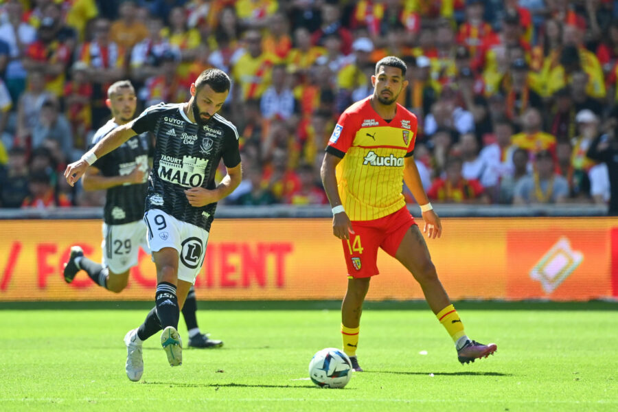 Franck HONORAT of Brest and Facundo MEDINA of Rc Lens during the Ligue 1 Uber Eats match between Lens and Brest at Stade Bollaert-Delelis on August 7, 2022 in Lens, France. (Photo by Anthony Dibon/Icon Sport)