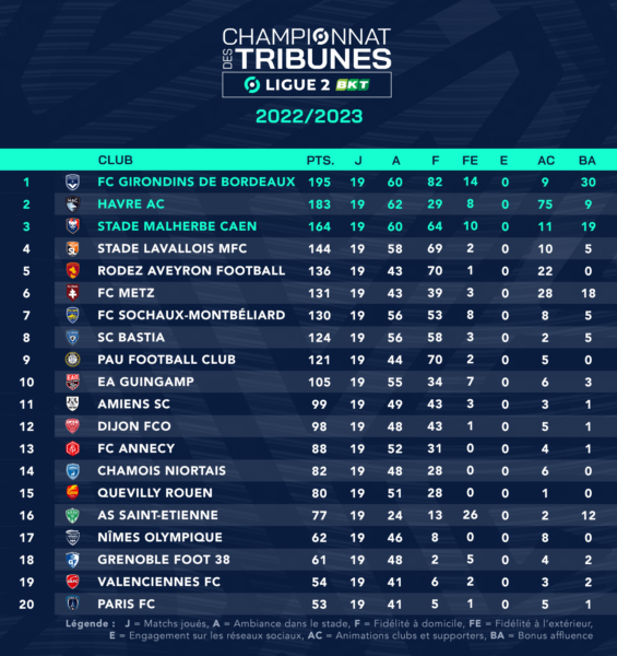 Treizième au classement sportif, on aurait pu penser que les tribunes stéphanoises soient bien mieux classées dans cette Ligue 2 BKT. Il n'en n'est rien puisque l'AS Saint-Etienne se trouve aujourd'hui 16ème au championnat des tribunes de L2.