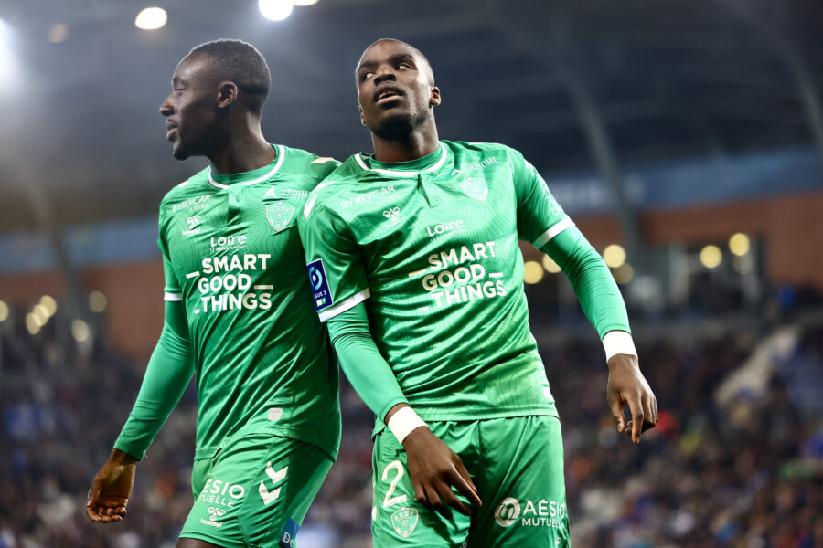 08 Dennis APPIAH (asse) - 27 Niels NKOUNKOU (asse) during the Ligue 2 BKT match between Grenoble and Saint-Etienne at Stade des Alpes on April 17, 2023 in Grenoble, France. (Photo by Alex Martin/FEP/Icon Sport)