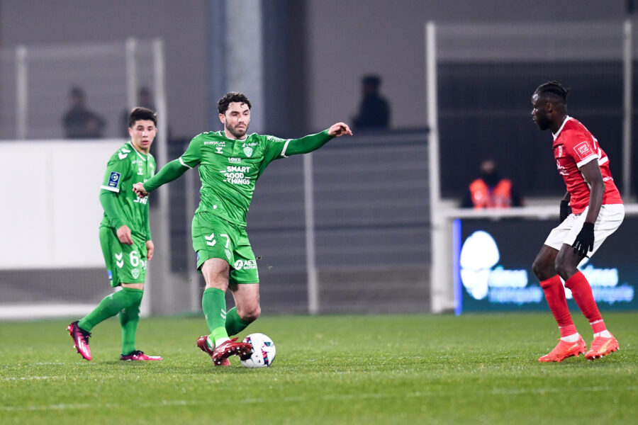 03 Mickael NADE (asse) - 10 Gaetan CHARBONNIER (asse) - 23 Anthony BRIANCON (asse) during the Ligue 2 BKT match between Nimes Olympique and AS Saint-Etienne at Stade des Costieres on February 20, 2023 in Nimes, France. (Photo by Philippe Lecoeur/FEP/Icon Sport)