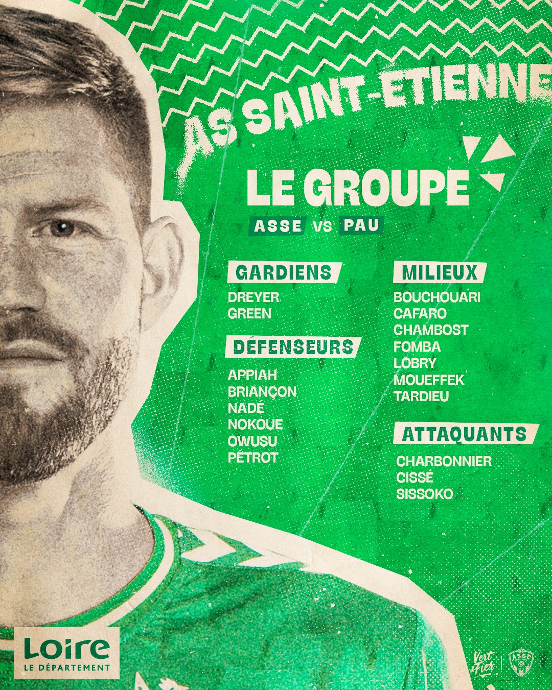 L'AS Saint-Ătienne retrouve la Ligue 2 ce samedi. Ils recevront le FC Pau Ă Geoffroy-Guichard. Coup d'envoi Ă 15 heures. Laurent Batlles a donnĂ© le groupe qu'il a retenu pour l'occasion.