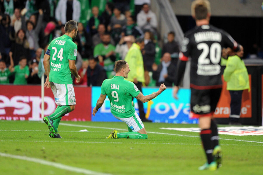 Nolan ROUX of Saint Etienne celebrates scoring his goal during the Ligue 1 match between AS Saint-Etienne and Dijon FCO at Stade Geoffroy-Guichard on October 16, 2016 in Saint-Etienne, France. (Photo
