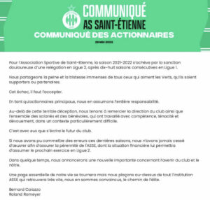 Communiqué officiel de l’AS Saint-Etienne après la relégation du club en Ligue 2 :