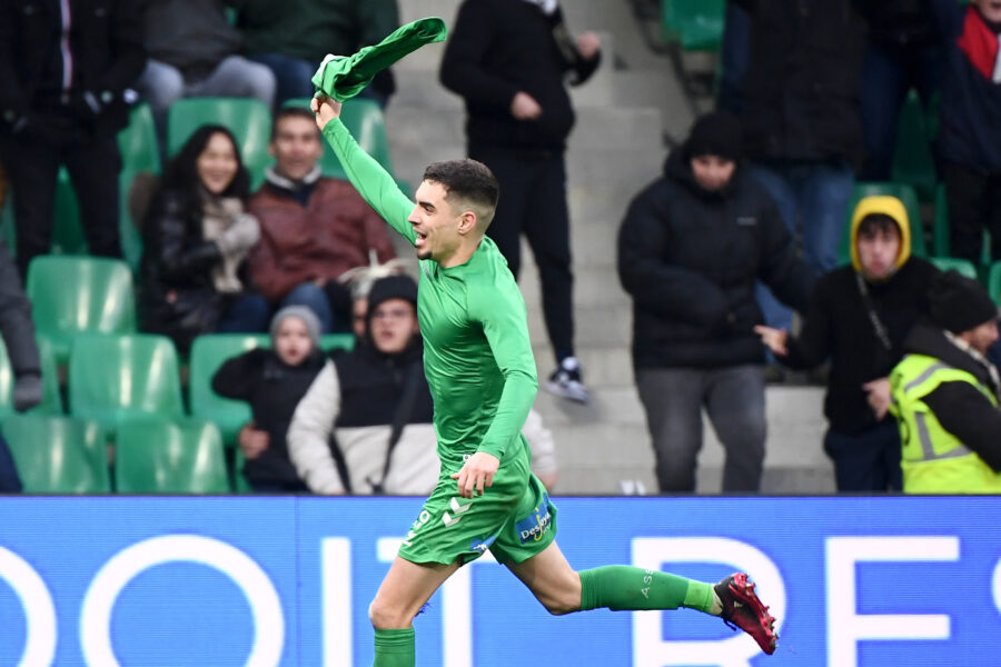 18 Mathieu CAFARO (asse) - 17 Jean-Philippe KRASSO (asse) during the Ligue 1 Uber Eats match between Saint-Etienne and Annecy at Stade Geoffroy-Guichard on February 4, 2023 in Saint-Etienne, France. (Photo by Christophe Saidi/FEP/Icon Sport)