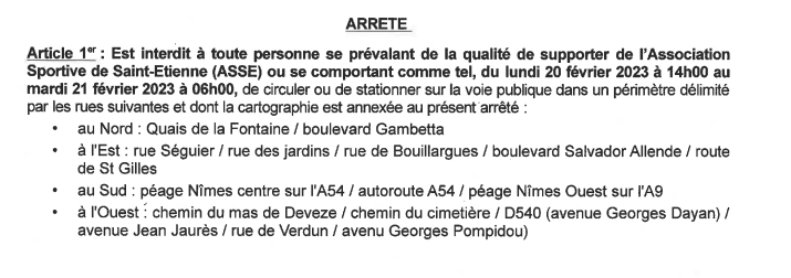 Dans cet arrêté, elle proclame l'interdiction d'aller et venir pour tout supporter se prévalant de la qualité de supporter dans un large périmètre défini, en dehors des 382 qui garniront le parcage du Stade des Antonins lundi à 20h45.