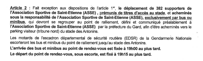 Dans un second article, la Préfète précise d'un côté qu'elle n'accédera pas à la demande des groupes stéphanois de pouvoir se rendre à Nimes en véhicules personnels. Ces derniers devront obligatoirement se déplacer à bord de bus ou minibus. D'un autre côté, alors que Madame La Préfète Marie-Françoise Lecaillon avait originellement fixée l'heure de rendez-vous à 18h30 sur une aire d'autoroute, les Groupes de supporters souhaitaient que l'heure soit décalée à 19h30. La préfète du gard a tranché en 2 : 19h sur l'aire définie.