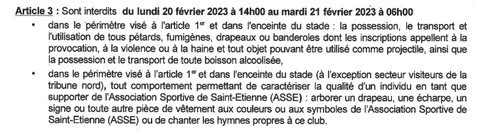 Enfin, dans un 3ème article, la Préfète interdit la détension de tout matériel pyrotechnique pour tous. Mais également à tout individu d'arborer des accessoires ou vêtements "permettant de caractériser la qualité d'un individu en tant que supporter de l'ASSE : drapeau, écharpe, pièce de vêtement aux couleurs ou aux symboles de l'ASSE ou de chanter les hymnes propres à ce club".