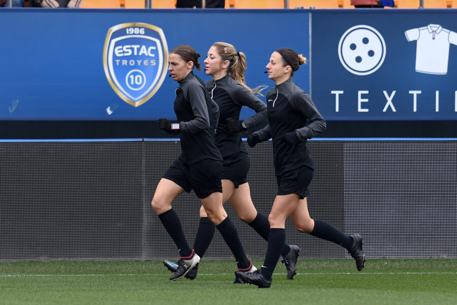 Manuela NICOLOSI (ARBITRE) - Stephanie FRAPPART (ARBITRE) - Elodie COPPOLA (ARBITRE) during the Ligue 1 Uber Eats match between Troyes and Monaco at Stade de l'Aube on March 5, 2023 in Troyes, France. (Photo by Philippe Lecoeur/FEP/Icon Sport)