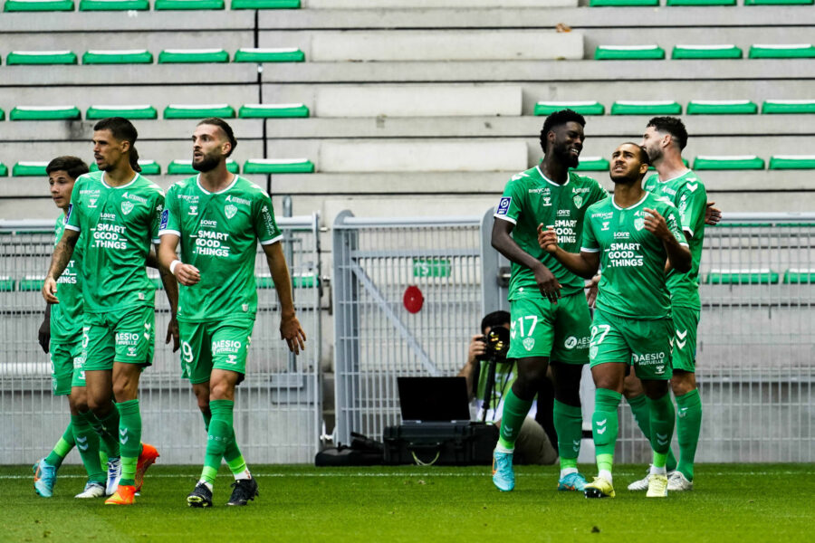05 Jimmy GIRAUDON (asse) - 19 Leo PETROT (asse) - 17 Jean-Philippe KRASSO (asse) - 27 Yvann MACON (asse) during the Ligue 2 BKT match between Saint Etienne and Bordeaux at Stade Geoffroy-Guichard on September 10, 2022 in Saint-Etienne, France. (Photo by Dave Winter/FEP/Icon Sport) - Photo by Icon sport